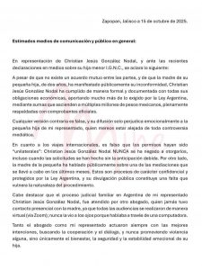 En dicho comunicado, los representantes legales de Nodal señalan que el cantante proporciona apoyo económico millonario para la manutención de su hija y que nunca ha impedido que Cazzu viaje con ella. Esto contrasta con las declaraciones de la cantante, quien aseguró que Nodal le impedía salir del país con la menor y no le brindaba ayuda económica, afirmando que pudo traer a su hija a México gracias a un permiso judicial unilateral.